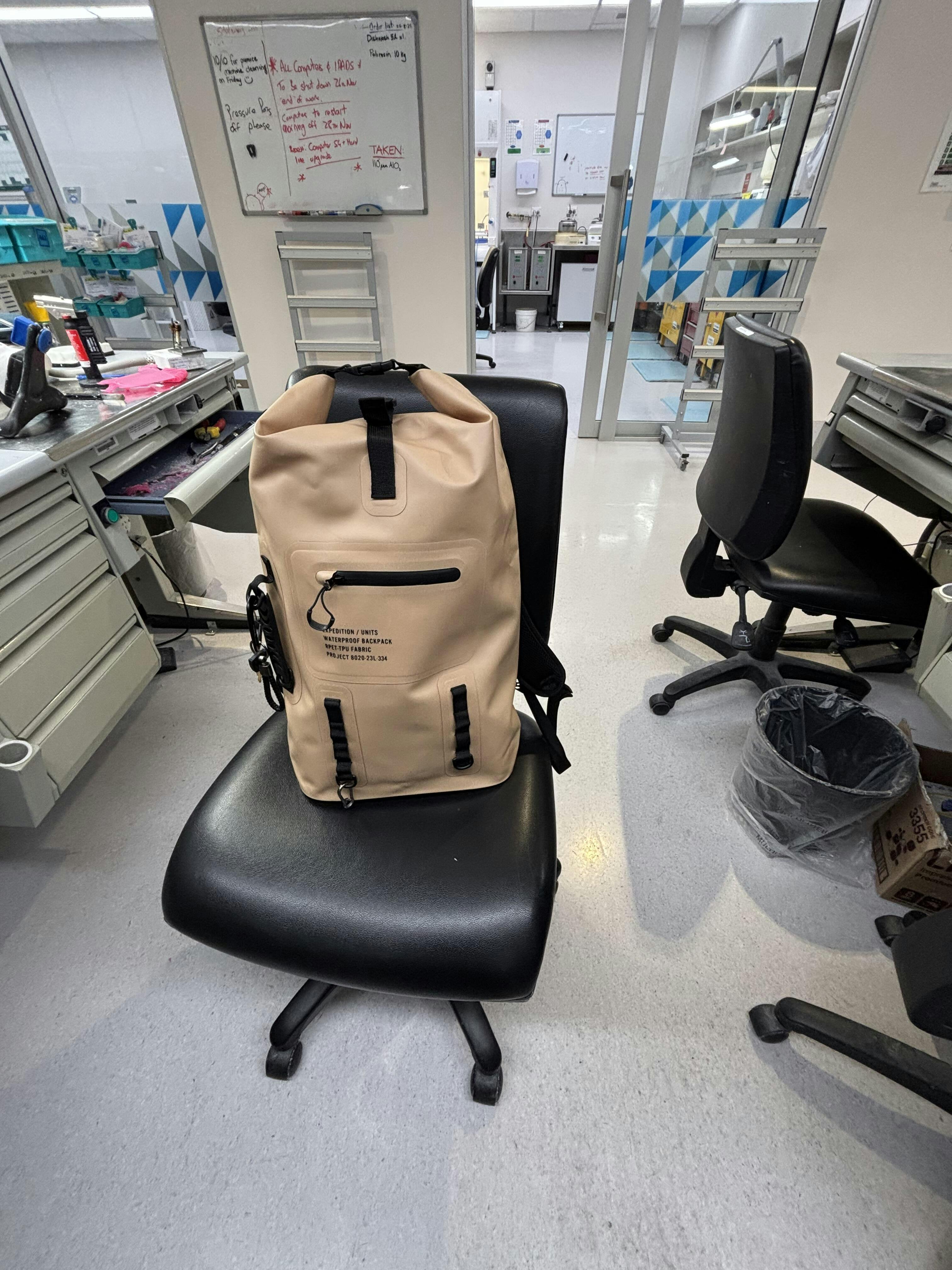 Waterproofing is achieved by radio frequency (RF) welding, a process that melts the layers of material together. A technology normally used in boats, which we used for our backpack.