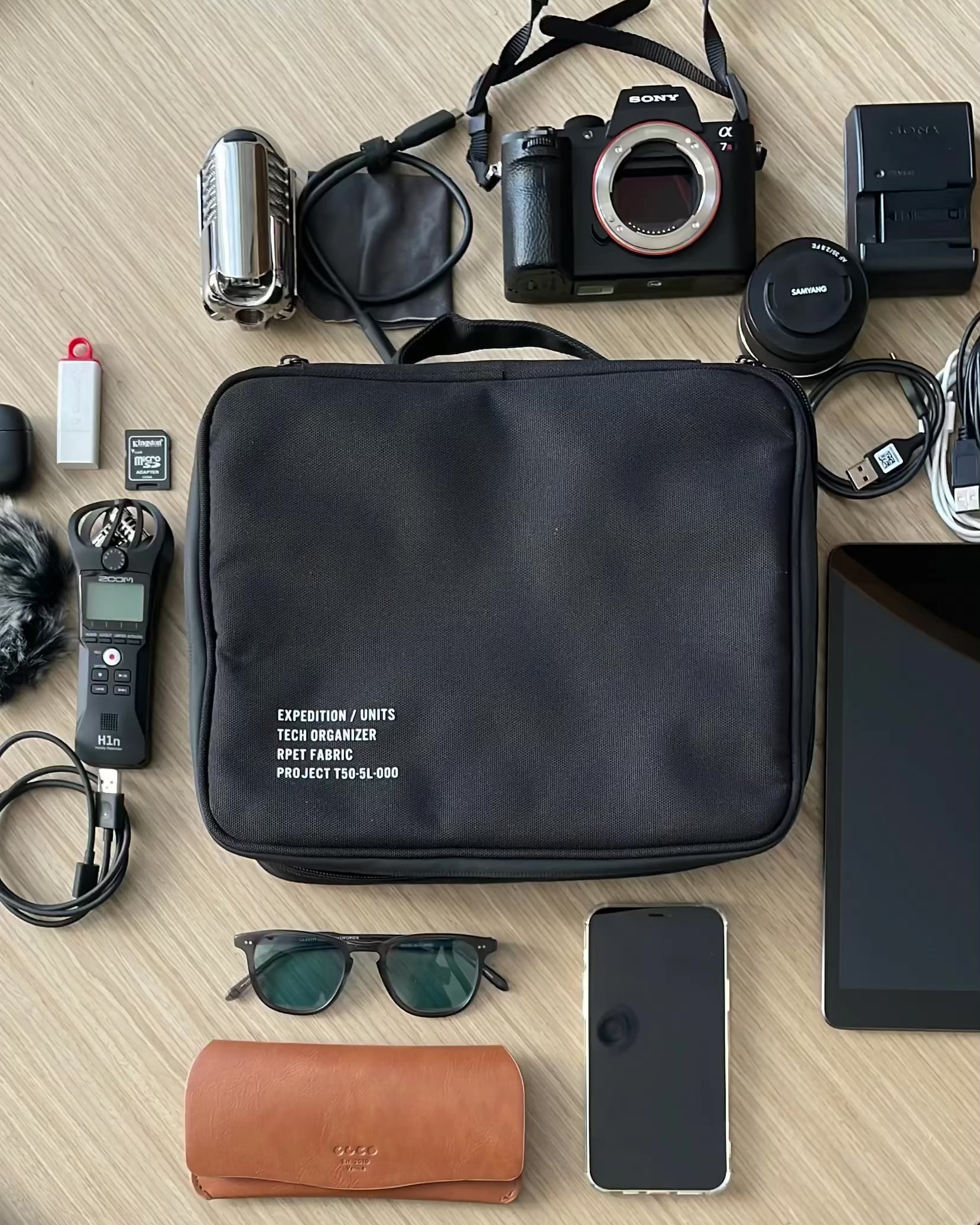 The double layer T50 is perfect for organizing all your cables, cards, hard drives, phones, lenses and mirrorless or small DSRL cameras.